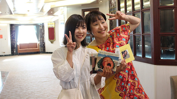 ウォルビスベイからご乗船いただいたのは、地球の広報・旅人・エッセイストとして活躍する、たかのてるこさん。ベストセラー『ガンジス河でバタフライ』をはじめ、『ダライ・ラマに恋して』など、さまざまな書籍を出版しています。出発前にたかのさんの書籍を読んだ方も多く、一緒に記念撮影をする姿も見られました。
