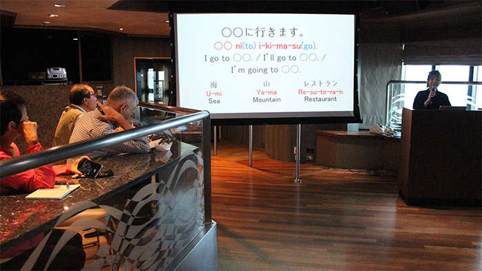 英語を話す方に向けた日本語教室でのヒトコマ。今回は、海、山などの単語や、それらを組み合わせた簡単な文章を作っていきます。参加したみなさんは、メモを取ったり時には録音したりと、熱心に耳を傾けていました。