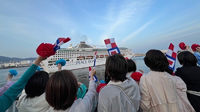 出航を告げる汽笛が鳴り響き、神戸港出航のときを迎えました。パシフィック・ワールド号はゆっくりと岸を離れていきます。「いってきます!」「楽しんできてね!」そんな声が、あちらこちらから聞こえてきます。いよいよ待ちに待った世界一周クルーズの幕開けです。