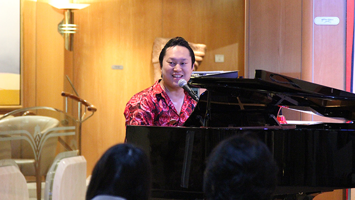パシフィック・ワールド号では、バーやアトリウムなどで専属ピアニストやバンドによる生演奏を楽しむことができます。音楽を聴きながらリラックスしたひとときをお過ごしいただけます。