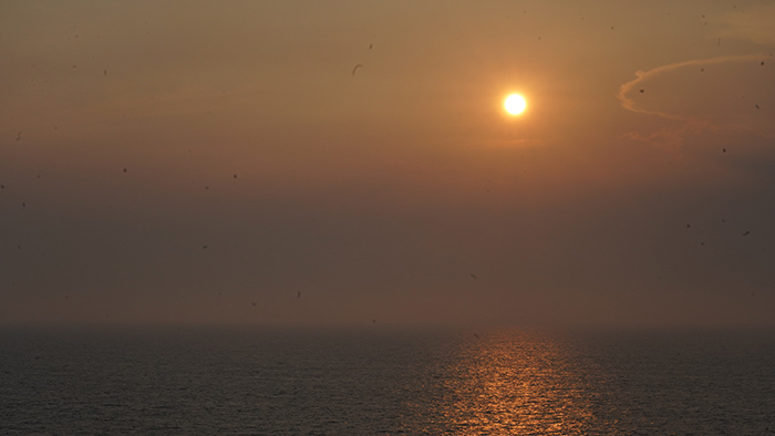 夕暮れ時、デッキに出てみると美しい夕日を見ることができました。夕日が海に反射して、オレンジ色の道ができたよう。デッキにあがればすぐにこんな風景を楽しむことができるのも、船旅だからこその魅力です。