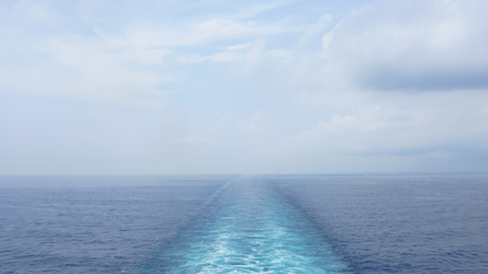 海の景色を楽しむために後方デッキへ行ってみると、まっすぐ後ろへ伸びる航跡を見ることができました。いつまでも眺めていたい、船旅ならではの美しい光景です。