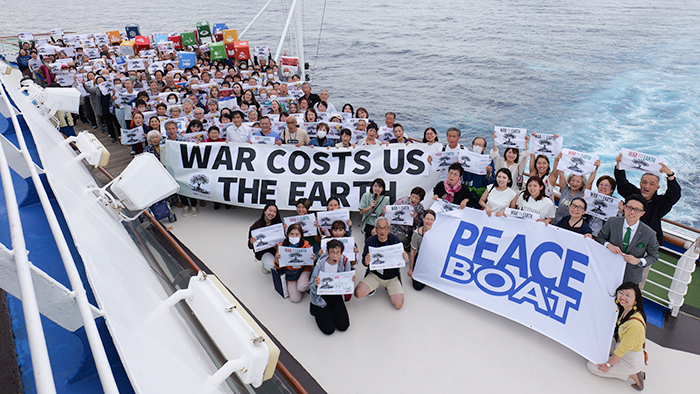 2015年からあがり続けている世界の軍事費。洋上では、「軍事費に対する世界アクション・デー(GDAMS)」の行動として、フォトアクションを実施しました。世界の軍隊が排出する温室効果ガスは、全体の約5%を占めていると言われています。限りある資源を、どのように使用するのかを考える時間となりました。