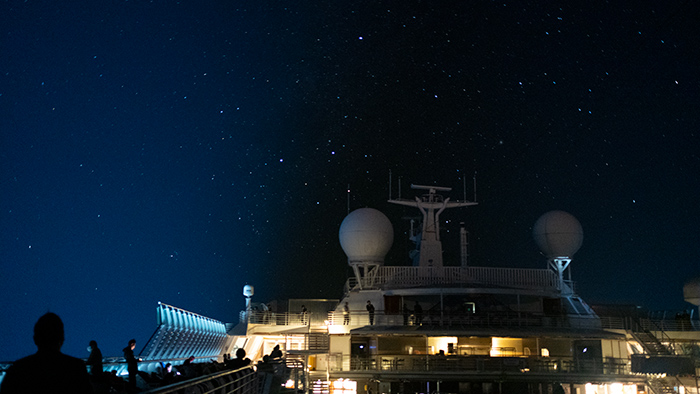 夜空を見上げるみなさん。デッキでは星空観望会が行われ、たくさんの人が参加しました。船以外に灯りがない海の上では、この海域ならではの美しい星空を見ることができます。