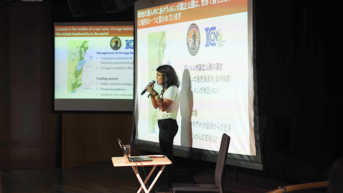 在セネガル日本国大使館や国連機関などさまざまな組織で勤務し、10年以上アフリカで生活している水先案内人の品川夏乃さんは現在、コンゴ民主共和国で最古の国立公園であるヴィルンガ国立公園で働いています。ここは、隣国ルワンダで発生した内戦がきっかけで、危機地域となってしまいました。講座では、そういった状況下での環境保護の取り組みについて、お話いただきました。