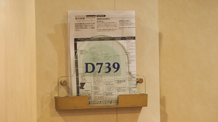 日々の船内生活に欠かせない船内新聞は、前日の夜に船室に届けられます。翌日開催されるイベントや講座などの場所や開始時間などが記載されており、これを見ながらスケジュールをたてることができます。