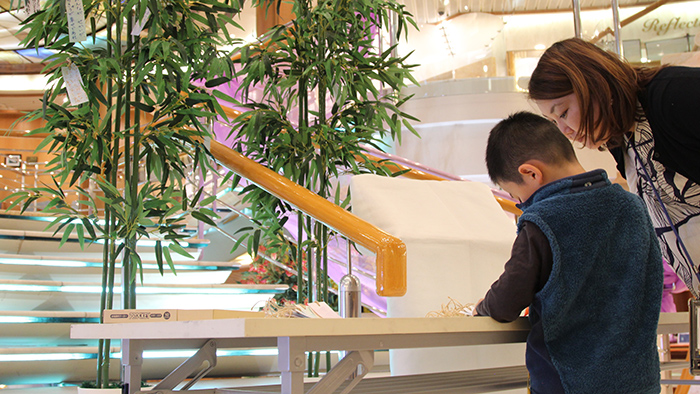 七夕の日を迎えた船内には笹竹が設置され、願いごとが書かれた短冊や、網飾り、吹き流しなどの七夕飾りで彩られました。フォトスポットも設置され、たくさんの人が笑顔で写真撮影をしていました。