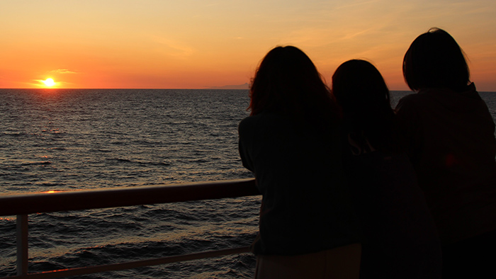 大海原にゆっくりと沈んでいく夕日。多くの人がデッキでその美しい光景を眺めていました。海と空が創り出す素晴らしい風景を、時間を忘れて楽しめるのも、船旅ならではの醍醐味です。