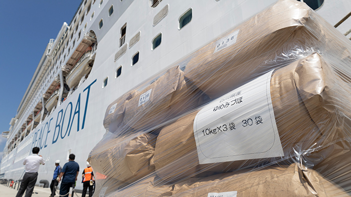 ピースボートクルーズで提供されているお米は、ここ石川県産のブランド米「ゆめみづほ」です。金沢の市場で仕入れられた新鮮な"加賀野菜"を含めた日本各地の野菜と、契約農家から届いた「ゆめみづほ」が、パシフィック・ワールド号へと積み込みされました。その総量22トン!今日も、つやつやな美味しいごはんが船内の各レストランで提供されます。