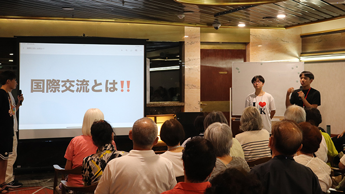 今クルーズでは、明星学園中学校とNGOピースボートが協力し、国際交流を体験するべく27名の中学生がシンガポールまで乗船しています。旅の終わりが近づき、クルーズでの日々を振り返る会が行われました。船内や寄港地での体験や出会い、感じたことなどを、それぞれの言葉で発表していきます。12日間の船旅は、素敵な夏の思い出となったことでしょう。