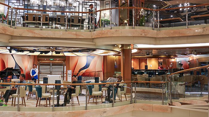 4層吹き抜けのアトリウムに位置する開放的なクルーナーズバーでは、コーヒーやカプチーノ、紅茶などのドリンクを飲みながら、音楽や読書を楽しむことができます。おひとりの時間はもちろん、船内でできた友人たちとの社交の場としても人気のスポットです。