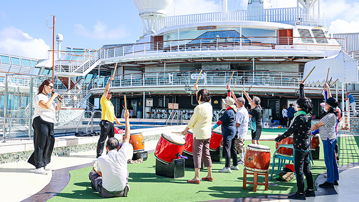 各国の文化を知るイベントとして「加茂網村太鼓」の代表による和太鼓教室がひらかれました。撥の持ち方や叩き方などがレクチャーされ、参加したみなさんは、真剣な表情で取り組んでいました。
