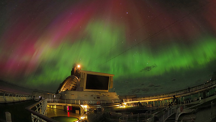 オーロラベルト圏内を航海中のパシフィック・ワールド号では、美しいオーロラを見ることができました。夜空に広がる神秘的な光の舞はとても幻想的で、見る人を魅了します。忘れられない一夜となりました。