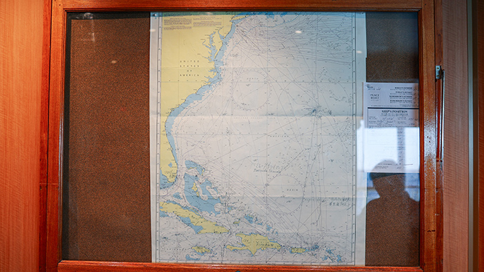 船がここまでどんな航路を辿ってきたのかは、船内に貼りだされた海図で確認することができます。海図が更新されると、写真に収めたり、持参した地図に位置を書き込んだりする人の姿も。これも旅の大切な思い出のひとつになることでしょう。