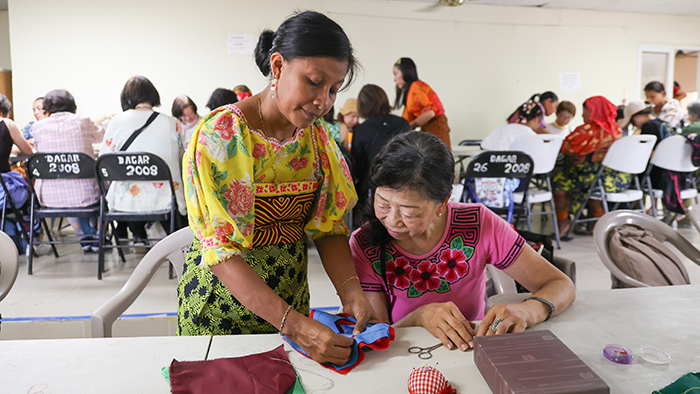 クリストバルでは、先住民族クナの文化を体験するオプショナルツアーも実施されました。クナの女性たちは、クナの人びとだけに伝わる美しい手芸「モラ」を縫い、身に着けることで代々伝わる伝統を守ってきました。ツアーでは、モラ作りを体験することができました。クナの人びとが受け継いできた歴史や文化を学び、交流を深めることができました。