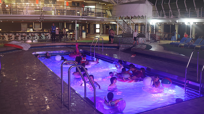 賑やかな夜のプール。昼間とは違った雰囲気のプールでみなさん泳いだり、くつろいだりと思い思いの時間を過ごしています。またひとつ、旅の思い出が増えました。