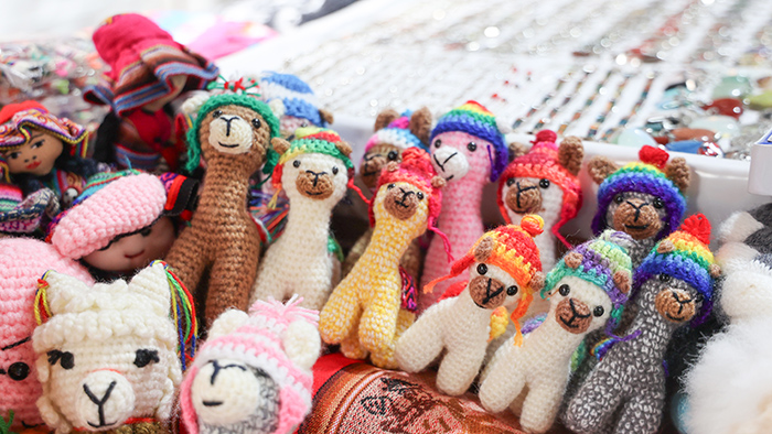 ペルーならではのおみやげを探して市場へ。民族楽器やカラフルな民芸品、アルパカの毛で作られたセーターなどが並んでいます。かわいらしいアルパカのぬいぐるみはひとつひとつ表情が違い、どれにしようか悩んでしまいます。