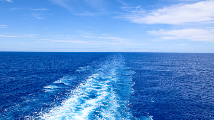 次の寄港地、タヒチのパペーテに向けて航行中のパシフィック・ワールド号。デッキからは、濃紺の美しい海を見ることができました。航海する海域によって変化する海の色に気づくことができるのも、ゆっくりと海を進む船旅ならではです。