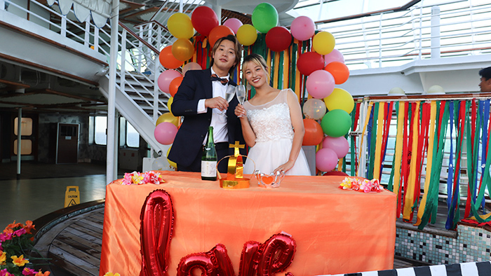 洋上で結婚の節目を迎えたカップルをお祝いするパーティーが開催されました。特別な時間を共有しようと、船内でできた友人たちも参列。ドレスアップしたお二人が登場すると、大きな拍手が起こりました。洋上での結婚式は、お二人にとってかえがえのない大切な思い出になったことでしょう。