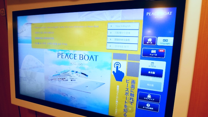 船内生活に必要な情報が掲載された船内新聞は毎日船室に届きますが、船内に数か所設置されたデジタルサイネージや、船内専用のWi-Fiに接続をしたご自身のスマートフォンやタブレット端末などでも見ることができます。デジタルサイネージではフロアマップなども確認でき、日々の船内生活にはかかせません。