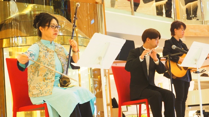 4層吹き抜けのアトリウムで、二胡奏者の張艶(チョウ・エン)さんと、専属ミュージシャンによるスペシャルステージが開催されました。二胡が奏でる繊細な音色に、フルートの澄んだ旋律とギターならではの温かい響き。その美しいハーモニーを心ゆくまで楽しみました。