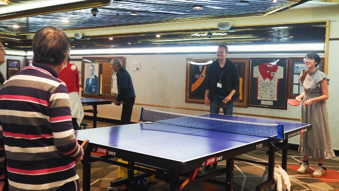 卓球は、船内で特に人気のあるスポーツのひとつです。世代や国籍を超え、多様な乗船者が集う船内では、このようなスポーツを通じて自然と交流が生まれます。ポイントが入るたびに思わずハイタッチ!笑顔があふれる、楽しいひとときをお楽しみいただけます。
