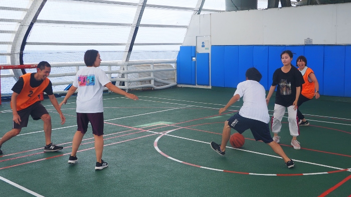 スポーツコートでは、バスケットボール大会が開催されました。選手たちは軽快にコートを駆け回り、シュートが決まるたびに歓声が上がります。心地よい潮風を感じながら、観客も一体となってスポーツを楽しみました。