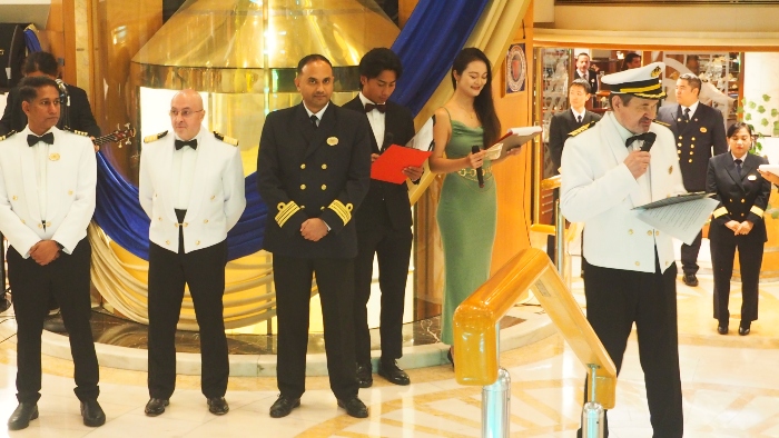 クルーズもいよいよ終盤を迎え、フェアウェルセレモニーが開かれました。船長の「乾杯!」の掛け声とともにグラスが高く掲げられました。集まった人びとは、旅仲間を記念写真を撮ったり別れの言葉を交わしたりしながら、名残を惜しんでいました。