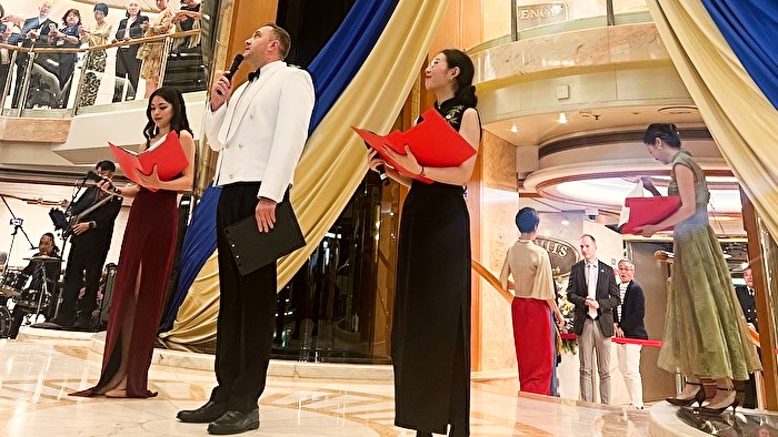 ウェルカムセレモニーが開催されました。開放的なアトリウムにはたくさんの人が集い、船長の「乾杯!」の声にあわせて、あちらこちらでグラスが高らかに掲げられました。旅の始まりを共に祝福する特別なひとときとなりました。