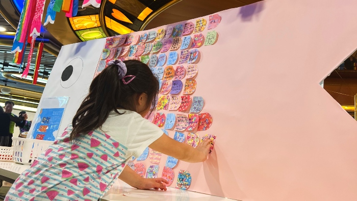 子どもの日と端午の節句に合わせて、船内にはこいのぼりが飾られました。こいのぼりのウロコに願い事を書いたり、けん玉や折り紙などの日本の伝統的な遊びを体験したりと、子どもたちはもちろん、童心に返って楽しむ人も。一日をとおして季節の行事を堪能しました。