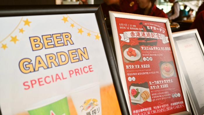 シンガポールを出港した船は、南半球の寄港地へと航海を続けています。今日は赤道通過を記念したイベントも開かれ、ビアガーデンには赤道にちなんで“赤い”メニューも登場!赤道通過に合わせるかのように、船のデッキは賑わいと熱気に包まれていました。
