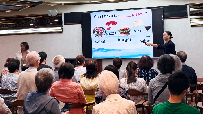 旅をしながら洋上で語学を学ぶプログラム「GET(Global English Training)」では、有料クラスに加えて誰でも無料で参加できるオープンクラスも用意されています。英会話のクラスでは、学んだあとにすぐ使ってみたくなる簡単なフレーズなど、知ることでもっと旅が楽しめるようなレッスンが行われていました。