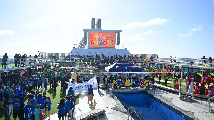 年齢、性別、国籍の垣根を越えて交流を促すことを目的に、航海中の船内で「洋上運動会」が開催されました。競技内容は、綱引きや玉入れなど、どなたでも気軽に参加できるものばかりで、乗船者の多くが参加し、大いに盛り上がりました。