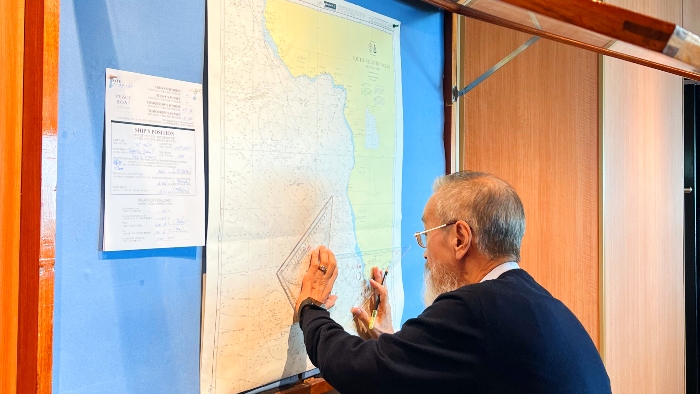 船内には、パシフィック・ワールド号の航路を記した海図が掲示されています。海図が更新されるたびに、旅の記録として写真に収めたり、持参した地図に自分の手で書き込む方もいらっしゃいます。この海図は、船の進路を示すと同時に、世界が海でつながっていることを改めて感じさせてくれる、クルーズならではの、特別な存在です。