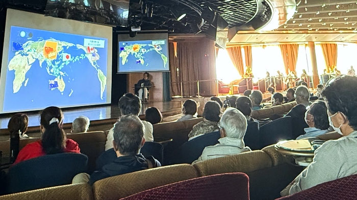 日本ユネスコ協会連盟の元事務局長として、約30年にわたり世界遺産の保護や広報に携わってきた水先案内人の吉岡淳さん。今日は、近年ニュースなどでも耳にする「マイクロプラスチック」が、海を通じて地球規模で汚染を引き起こしている現状をお話くださいました。便利すぎる現代の暮らしを見直し、地球に負荷をかけない生き方を語る吉岡さんのお話を、皆さん熱心に聞き入っていました。