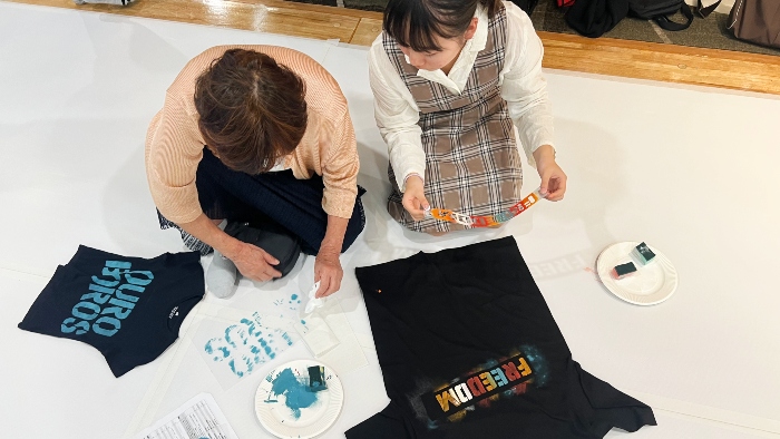 先日、迫力あるライブペイントを披露してくださった、アーティストのDRAGON76さん。今日はDRAGON76さんが描いた下絵の型に、染料で色をのせてオリジナルアイテムを作るステンシルワークショップが開催されました。スポンジを使ってTシャツやバッグなど手持ちのアイテムに好みの色をのせていくと・・・おしゃれでクールなオリジナルアートが完成しました!