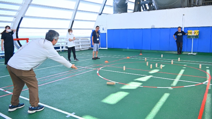 船内で人気のモルック。フィンランド発祥のスポーツで、数字の書かれた木製のピンにモルック棒を投げ当ててチーム戦で得点を競います。この日は船のスポーツコートで、初心者の方も含めた8チームが参加して大会が開催されました。モルックは年齢や性別、障がいの有無にかかわらず、誰もが一緒に楽しめるスポーツ。ギャラリーの方たちの温かい声援を受けながら、皆さんモルックの奥深さを楽しんでいらっしゃいました。