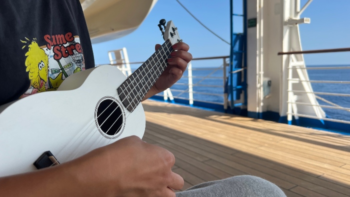 長期のクルーズ旅行では、ご自身の趣味や、ずっとやりたかったことに挑戦される方も大勢いらっしゃいます。楽器を持参される方も多く、開放的な船内のさまざまな場所で、楽器演奏を楽しむ方の姿を見かけます。青空と澄んだ海を望みながら音を奏でるひととき――好きなことに思う存分向き合える豊かな時間が、ゆっくりと紡がれてゆきます。