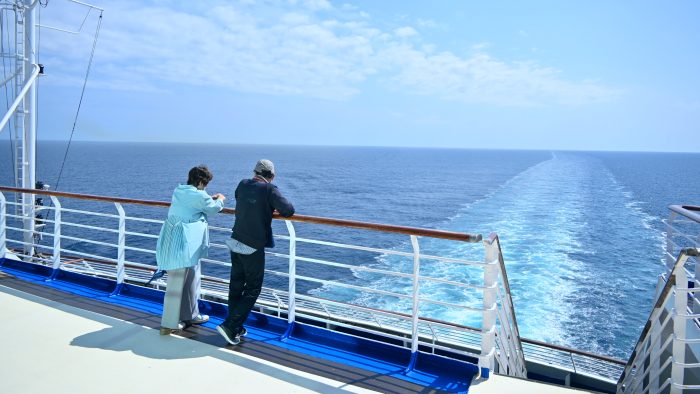 船をぐるりと囲むデッキでは、日々変わりゆく海と空の表情が楽しめます。ときにはイルカや海鳥などの生き物たちの姿を見かけたり、遠くを航行する大型タンカーを目にすることも。暮らすように旅する毎日に、海と空が静かに寄り添います。