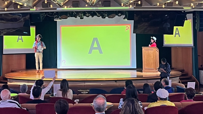 船や航海にまつわる雑学から、本クルーズの航路に関連した問題まで、船旅にちなんださまざまなクイズにチーム戦で挑む「クイズ・オブ・ザ・シー」が開催されました。知識のみならず、チームワークも重要とあって、メンバーで答えを予想し合いながらクイズを楽しむ姿が見られました。
