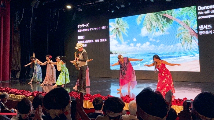 参加者自身が企画して実施され、ピースボートクルーズの大きな楽しみの一つでもある自主企画。この日は旅のフィナーレを前に、集大成となる発表会が行われました。ステージ部門では歌やダンス、楽器の演奏やマジックなど、実に多彩な演目が披露されました。それぞれの企画に参加者された方たちからにじみ出る、充実感と楽しそうな雰囲気――100人いれば100通りのクルーズライフがあることを、改めて感じることのできた時間となりました。