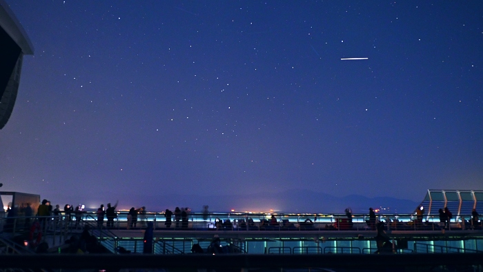 船上から眺める星空は、まさに天然のプラネタリウム。陸地に近い場所を航行しているときには、街灯りと星空の競演も楽しめます。ときには流れ星に遭遇することもあり、デッキに居合わせた人同士で「流れ星、見えましたよね!」と、うれしそうに声をかけあうシーンも見られます。