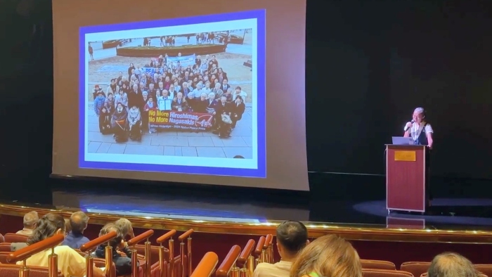 2024年にノーベル平和賞を受賞した日本被団協(日本原水爆被害者団体協議会)。NGOピースボートは、長年にわたって日本被団協と連携し、核兵器廃絶と被爆の実相を世界に伝える活動に取り組んでまいりました。そして、NGOピースボートとノルウェーの「ノーベル平和センター」の提携により、2025年よりノーベル平和賞記念展示が本船にてご覧いただけるようになっています。この日は、その貴重な展示内容や受賞の背景を紹介する企画が行われ、多くの参加者が関心を寄せていました。