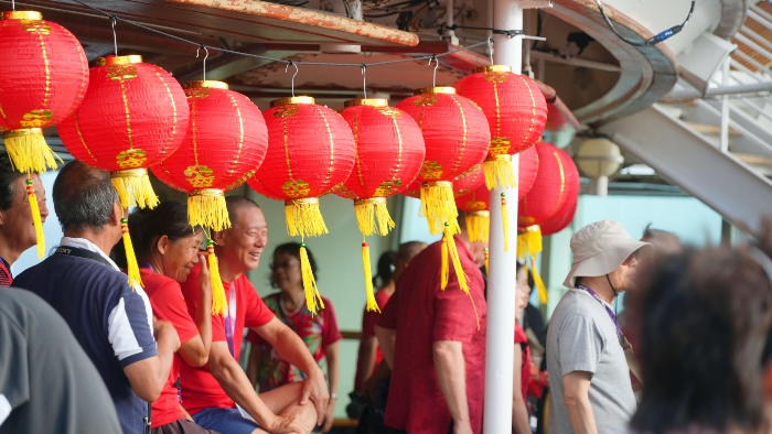 アジアの多くの地域には、旧暦に基づいた新年を祝う「春節」の伝統があります。リオデジャネイロ出港後のこの日は、そんな春節にふさわしい華やかなパフォーマンスステージが開催されました。春節には欠かせない赤い提灯が飾られたデッキでは、獅子舞や伝統のダンス、ドラゴン・パフォーマンスなどが披露され、賑やかな時間を笑顔で楽しむ方たちの姿が見られました。