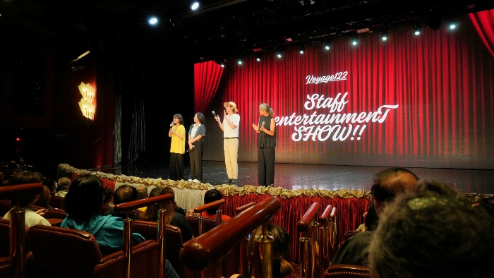 本クルーズにご乗船いただいた皆さまへ、これまでの感謝の気持ちをお伝えしようと、クルーズスタッフが総出演するエンターテインメントショーが開催されました。ステージでは、ダンスやコーラス、力強い太鼓の演奏に加え、ユーモアあふれる寸劇など多彩な演目が次々と披露され、会場は大盛り上がり。スタッフの思いが詰まった手作りのステージで、皆さまに笑顔あふれる特別なひとときをお楽しみいただきました。