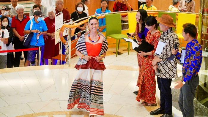 航海中の楽しみのひとつである、クルージングパーティー。毎回さまざまなテーマで催され、ドレスアップした非日常のひとときを楽しみにされている方も多いイベントです。この日は「ワールドカルチャーファッションショー」と題して、今回の旅で訪れた寄港地や、ご自身のルーツである国や地域にまつわる衣装を身に着けた皆さんが、華麗にランウェイを歩きました。会場となったアトリウムは、集まった観客からの拍手や歓声に包まれ、笑顔あふれる華やかな時間となりました。