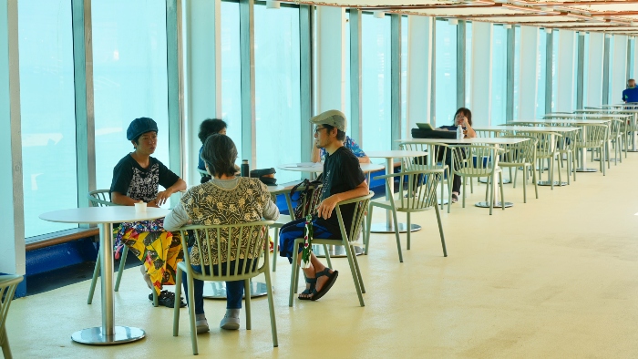 洋上では、暖かい日が続くようになってきました。そんな日は海の見えるデッキや、屋外のエリアで過ごす方も多くいらっしゃいます。ご友人同士でおしゃべりを楽しんだり、おひとりで気ままな時間を過ごしたり、皆さんリラックスしたひとときを過ごしているようです。