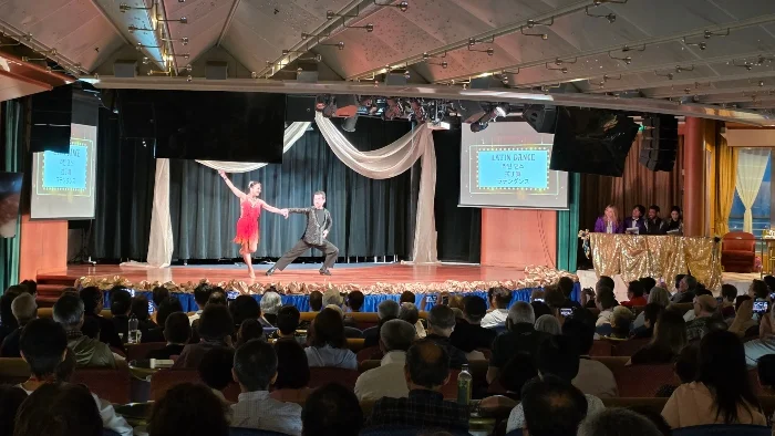 先日の講座で紹介された「ノーベル平和賞洋上特別展」が、いよいよ船内でスタートしました。会場の壁面には、1945年の広島・長崎への原爆投下以降、核兵器廃絶に向けてすすめられてきた国際社会の歩みがパネルで紹介されています。また、2017年にノーベル平和賞を受賞したICAN(核兵器廃絶国際キャンペーン)や、同じく2024年に受賞した日本被団協(日本原水爆被害者団体協議会)の取り組みに関するコーナーもあり、訪れた人たちはひとつひとつの展示にじっくりと向き合っていらっしゃいました。
