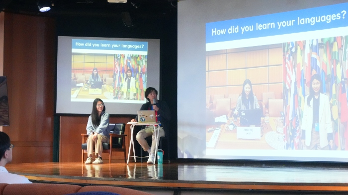 普段、船内の企画や講座、寄港地でのツアー等で通訳をはじめとした言語サポートを担っているコミュニケーションコーディネーターの皆さん。この日の企画では、起業家や指揮者、元国連職員など、彼らの個性豊かなバックボーンの一部を紹介するとともに、どのようにして言語を習得したかなど興味深い話もたくさん聞かせてくれました。