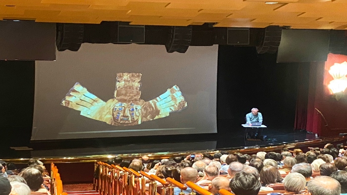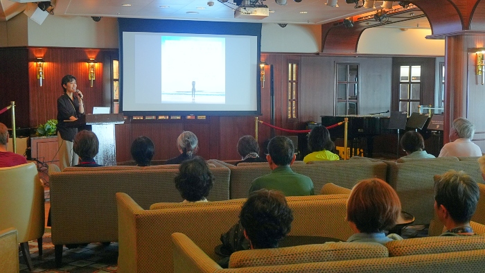長年にわたり古代アンデス文明の発掘現場の撮影をしている写真家・義井豊さんによるアンデス文明講座。この日はアンデス地域の古代文明の中でもとりわけ豪華な黄金製品が発掘されたシカン遺跡をはじめ、今も多くの謎が残るインカ帝国のマチュピチュ遺跡について、写真とともに解説してくださいました。このような事前レクチャーが行えるのは、クルーズ旅行の大きなメリット。学びと知識を深めながら、寄港地での新たな出会いに期待が高まります。